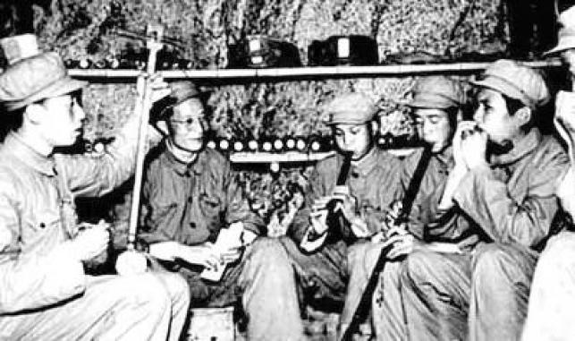 王莘在抗美援朝战场和慰问团排练《歌唱祖国》(左二为王莘)。(素材:共产党员网)