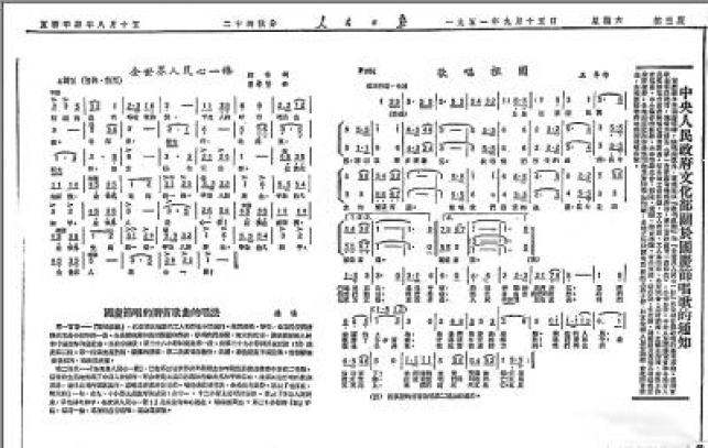 一年后,1951年9月15日,《人民日报》刊登了《歌唱祖国》的歌词与曲谱,并刊发了《中央人民政府文化部关于国庆节唱歌的通知》,要求全国范围学唱这首歌。