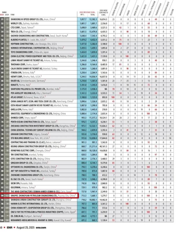 近日,美国《工程新闻纪录(ENR)》正式揭晓2025年度“全球最大250家国际承包商”榜单。公司所属的中原石油工程公司凭借优异的国际业务实力位列第94名,较去年提升8个位次,并在入选的76家中资企业中位居第26位。此次登榜标志着该公司连续19年蝉联该权威排名,并创下历史最佳排名成绩。