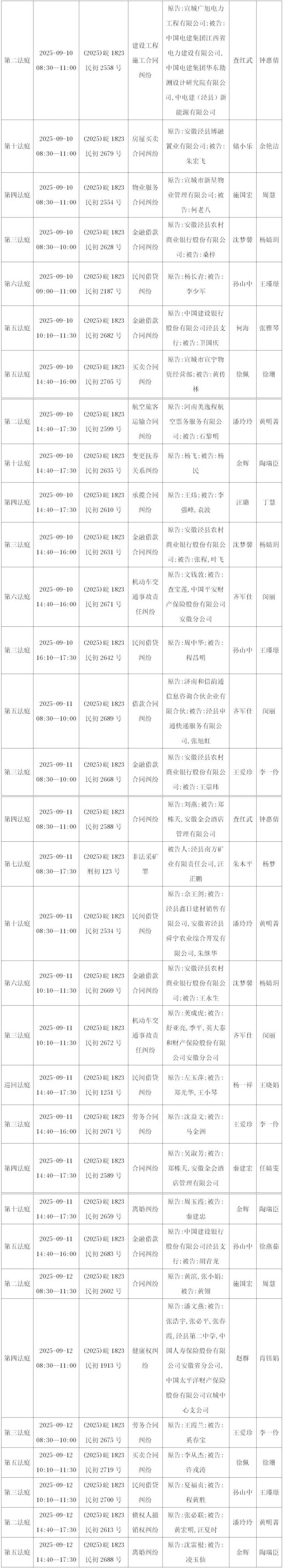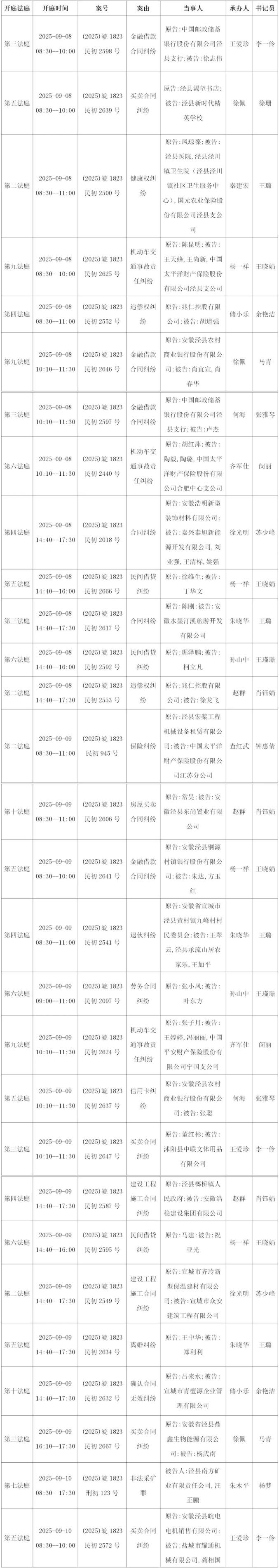 原标题:《【开庭公告】2025年9月8日——2025年9月12日 泾县法院开庭公告》