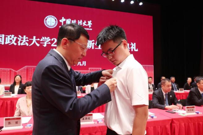 姜泽廷将校徽佩戴于2025级新生代表的胸前,同时2025级全体新生也满怀敬意将这枚承载着荣耀、使命与精神传承的校徽,庄重地佩戴在自己的胸前。这熠熠生辉的“中国政法大学”6个字,将深深印刻进每一位新生的心中,指引着他们在未来的路上忠诚担当、艰苦奋斗、求真务实、奉法图强。
