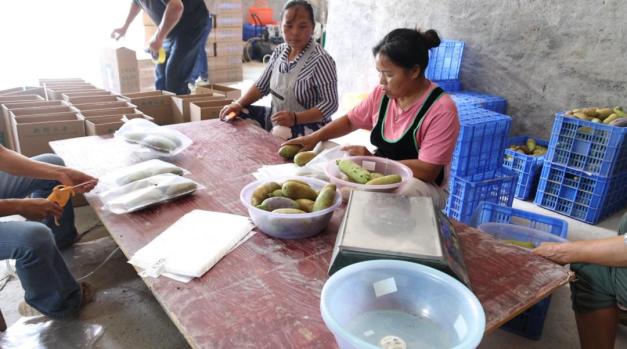 饱满的热情伴着果子的清香,让路过的人都忍不住想上前尝一口。与此同时,基地田垄间,几位村民正小心翼翼采摘着成熟的八月瓜,她们篮子很快便被装满;而在不远处的仓库里,另一批村民已准备好打包材料,按照 “早上采摘、下午发货” 的节奏,将新鲜果子分装、贴单,确保当天的订单能及时发往全国各地。