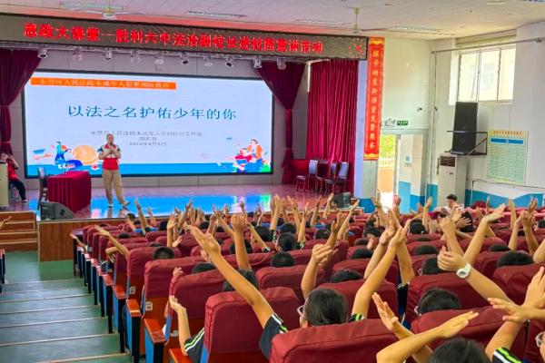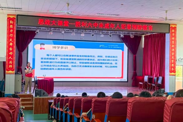 近日,东营区法院未成年人审判社会工作站负责人胡君玫走进东营市胜利第六中学,为学生们送上了反对校园暴力为主题的法治大礼包,助力学生们开启新学期新篇章。