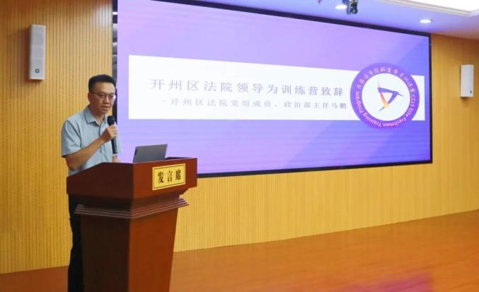 9月3日上午,训练营开营仪式在开州法院群团活动中心隆重举行。开州法院党组成员、政治部主任马鹏与西南政法大学民商法学院党建组织员雷铿共同为训练营授旗。马鹏主任在致辞中表示,本次训练营是推进院校深度合作、培养高素质法治人才的重要实践,并对学员们的到来表达了热烈欢迎。
