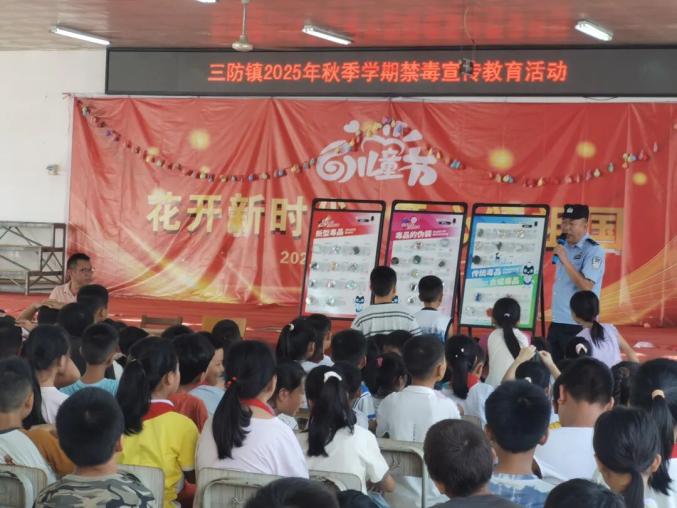 三防镇则在开学典礼之际同步开展禁毒宣传。禁毒“螺警官”结合案例揭示毒品危害,介绍伪装成“棉花糖”的新型毒品。现场设置的禁毒知识展板、仿真毒品模型展示台及宣传手册发放,让学生在互动中增强防范意识,同时鼓励学生带动家人共学,化身“小小禁毒宣传员”。