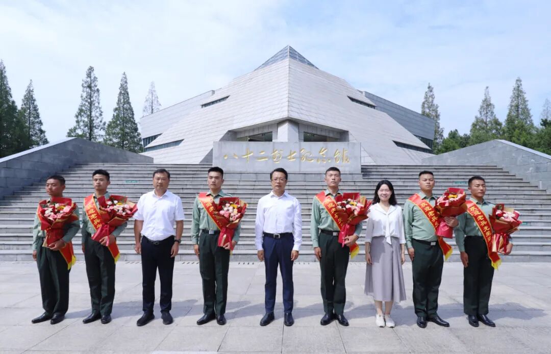 在八十二烈士纪念馆前,邓萌等领导为6名退役军人逐一披绶带、戴红花,并献上鲜花。整个仪式庄重简朴,体现了家乡人民对退役军人的崇高敬意和热烈欢迎。
