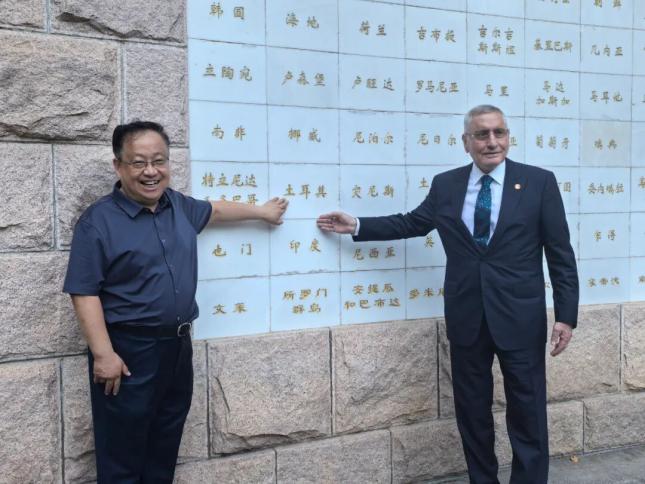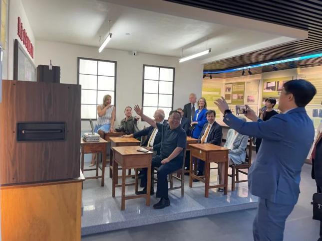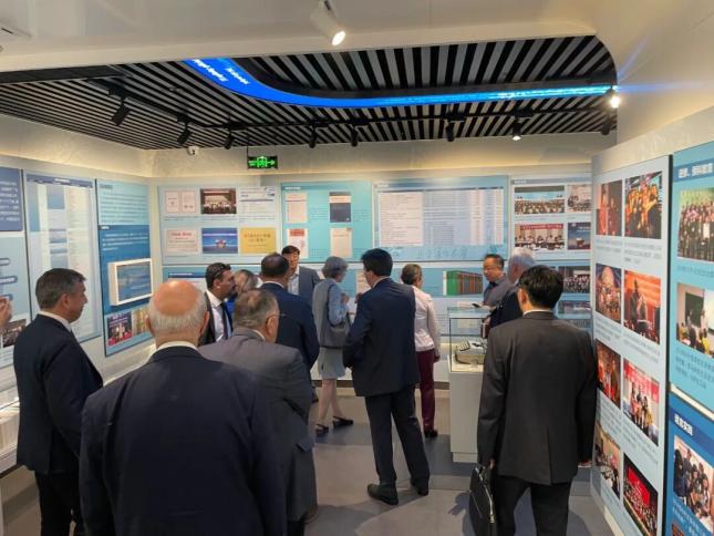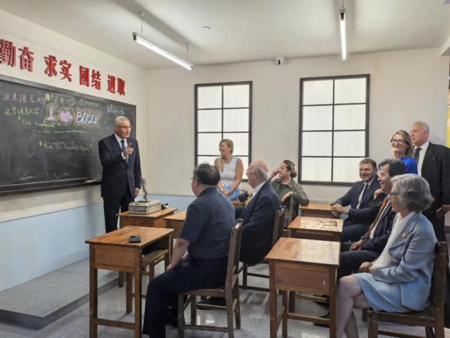 代表团抵达北语后首先前往校史馆参观,了解北语的建校历程、办学成果以及与世界各国教育交流合作的丰硕成果。馆内丰富的史料和图片引起客人们的浓厚兴趣。在看到陈列室内的老式教室和课桌后,客人们尤其兴致盎然,纷纷坐下来感受当年艰苦条件下热情求学的氛围。客人们随后来到万国墙,感受北语的“小联合国”美誉,并饶有兴趣地寻找土耳其国名,随后在墙前集体合影。