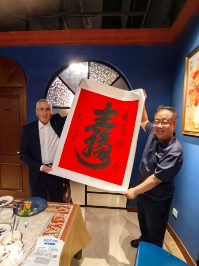 在访问结束之前,罗林教授和查潘先生互赠礼物。罗林教授特意赠送查潘先生一幅红色寿字中堂书法作品,祝愿80岁高龄的查潘先生健康长寿,继续为中土友好事业持续贡献智慧与力量。查潘先生也热情邀请罗林教授尽快访问土耳其和土中友好基金会。