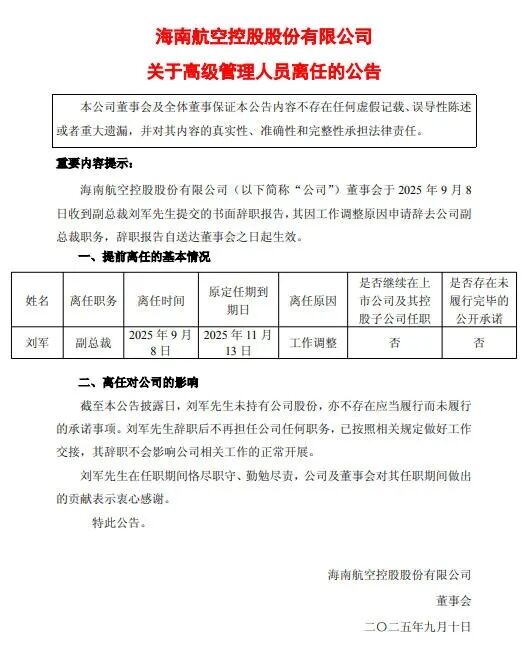 9月9日,海航发布公告称:海南航空控股股份有限公司董事会于2025年9月8日收到副总裁刘军先生提交的书面辞职报告,其因工作调整原因申请辞去公司副总裁职务,辞职报告自送达董事会之日起生效。