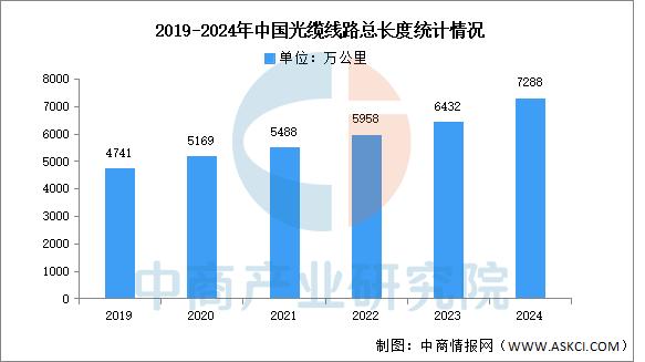 光通信设备构建光纤传输网络,承担绝大部分的数据流量传输。随着国家整体网络建设和数字经济发展,5G网络的建设及千兆光纤的升级等带动市场需求持续提升,光缆线路总长度稳步增加。中商产业研究院发布的《2025-2030年中国光纤光缆市场深度分析及发展趋势预测报告》显示,2024年中国新建光缆线路长度856.2万公里,全国光缆线路总长度达7288万公里。