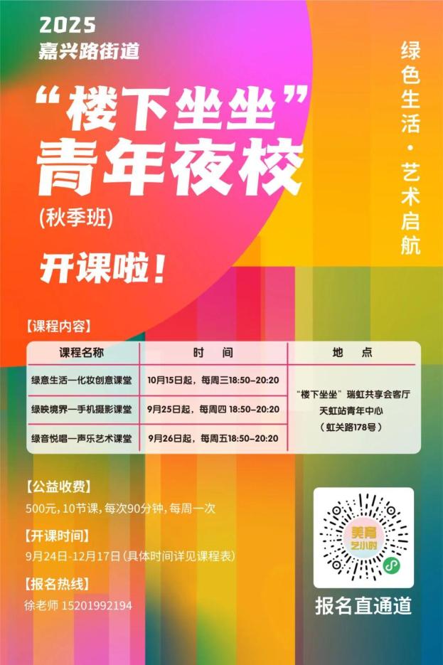 原标题:《【青年夜校】嘉兴路街道、曲阳路街道2025秋季班报名开始啦~多彩课程等你来!》