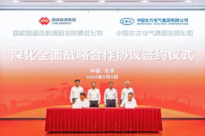9月9日,国家能源集团党组书记、董事长邹磊在集团总部与东方电气党组书记、董事长罗乾宜举行工作会谈,并共同见证双方签订深化全面战略合作协议。国家能源集团总经理、党组副书记冯来法,党组成员、副总经理傅振邦,东方电气总经理、党组副书记张彦军,党组成员、副总经理王军参加会谈。傅振邦、王军代表双方签约。
