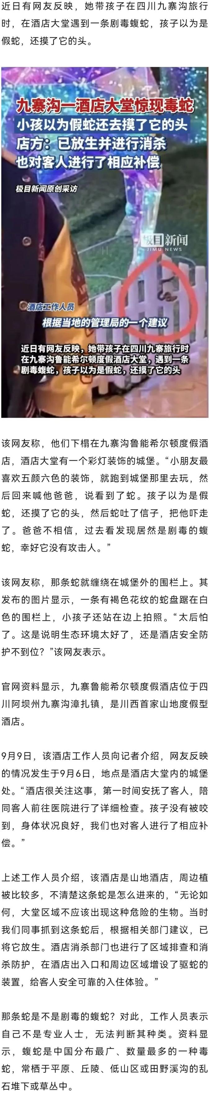 酒店大堂惊现褐色花纹的蛇,小孩以为是假蛇还上前去摸……店方:已放生并进行消杀