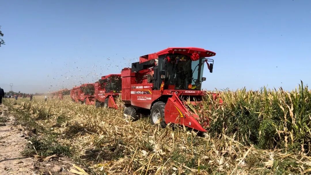 金秋九月的河西走廊,连片玉米田褪去青纱,空气中弥漫着丰收的清甜。2025年9月8日上午,甘肃省张掖市甘州区碱滩镇普家庄村的农场田间格外热闹——21台“巨明机械”标识的制种玉米收获机整齐列阵,“巨明红”机身在阳光下格外醒目。备受瞩目的全省制种玉米收获机熟化样机投放及现场演示活动在“黄金育种基地”举行。