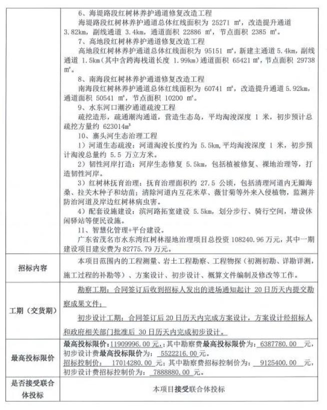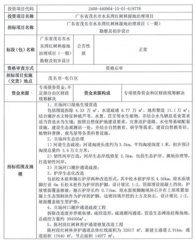 近日,省公共资源交易平台发布了《广东省茂名市水东湾红树林湿地治理项目(一期)勘察及初步设计招标公告》。据公告信息,水东湾红树林湿地治理项目包括:1.旦场河口湿地生境营造;2.旦场河生态治理;3.护岸生态化改造;4.旦场河口潮汐通道疏浚工程;5.陈村段红树林养护通道修复改造工程;6.海堤路段红树林养护通道修复改造工程;7.高地段红树林养护通道修复改造工程;8.南海段红树林养护通道修复改造工程;9.水东河口潮汐通道疏浚工程;10.寨头河生态治理工程;11.智慧化管理+平台建设。