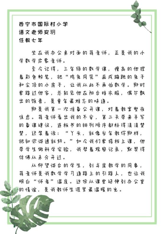 二十多年前,安玥还是西宁市国际村小学的一名学生,蒋阔沣是她的数学老师。那时蒋老师总把公式讲成身边事,鼓励她积极回答问题。这份温柔,在她心里种下 “当老师” 的种子。