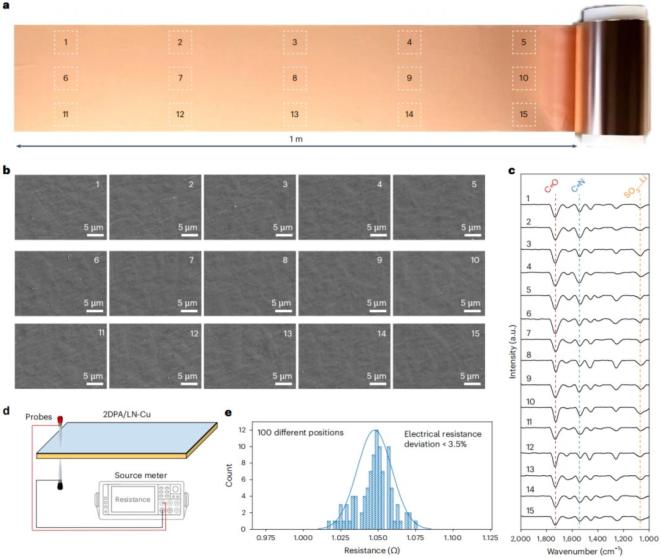 通过刮刀涂覆法在铜箔上制备了尺寸为100×20 cm2的大面积2DPA/LN界面层(图2a)。在15个不同位置拍摄的扫描电子显微镜(SEM)图像显示,大面积2DPA/LN界面层的形貌具有一致性(图2b)。傅里叶变换红外光谱(FT-IR)在1732、1536和1066 cm-1处分别检测到C=O、C=N和SO3…Li+基团的特征吸收峰,从而证实了2DPA/LN界面层在铜箔上的存在(图2c)。对2DPA/LN-铜箔的上下表面之间的电阻测量表明,在100个不同位置的电阻测量结果具有极高的均匀性,偏差小于3.5%(图2d,e),这表明2DPA/LN界面层在大面积上具有均匀性。