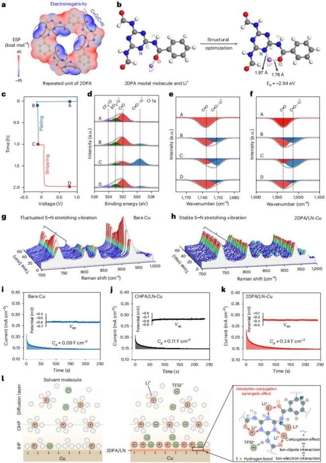 通过密度泛函理论(DFT)计算和多种实验手段,深入探究了2DPA与Li+之间的吸附-共轭协同效应。DFT计算表明,Li+与2DPA中的C=O和C=N基团存在离子-偶极相互作用,结合能为-2.94 eV,键长分别为1.78 Å和1.97 Å。这种相互作用基于2DPA的共轭结构和丰富的Li+吸附位点,能够有效促进Li+在负极-电解液界面的均匀分布,形成大且稀疏分布的锂核,从而促进平面生长。通过原位X射线光电子能谱(XPS)和傅里叶变换红外光谱(FT-IR)验证了2DPA/LN界面层在实际电池操作条件下与Li+的可逆吸附和解吸。原位拉曼光谱进一步证实了2DPA/LN界面层能够改善Li+通量的均匀性,延迟Sand时间,实现均匀的锂沉积。此外,2DPA/LN界面层通过调节内亥姆霍兹平面(IHP),显著降低了Li+传输的活化能,从裸铜的41.4 kJ/mol降低到28.1 kJ/mol,提高了Li+的传输动力学。这些结果表明,2DPA的吸附-共轭协同效应在促进Li+均匀吸附和传输方面具有显著优势,为高性能无负极锂金属电池的开发提供了重要的理论和实验依据。
