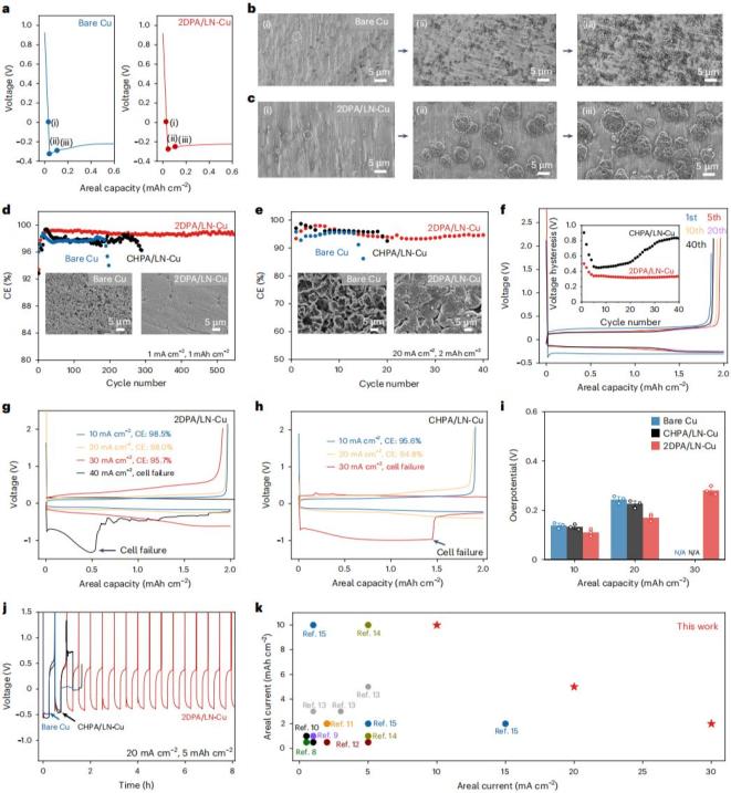 图4. Li||2DPA/ LN-Cu电池的电化学性能及锂沉积形貌。