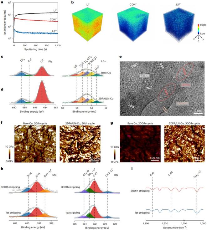 基于飞行时间二次离子质谱(TOF-SIMS)和X射线光电子能谱(XPS)分析了基于2DPA/LN界面层的固体电解质界面(SEI)化学,以揭示其对无负极电池电化学性能的重要影响。结果表明,2DPA主要分布在锂沉积的外表面,且通过TFSI-阴离子的分解形成了富含LiF的SEI层。这种SEI层的形成归因于TFSI-阴离子与2DPA中N-H基团之间的氢键相互作用,促进了TFSI-阴离子迁移到内亥姆霍兹平面(IHP)并分解形成LiF。此外,2DPA/LN-Cu展现出更高的Li3N含量,作为优秀的导体,促进了Li+的传输。相比之下,裸铜表现出严重的溶剂分解,阻碍了Li+的传输并导致锂金属的钝化。2DPA/LN-Cu的较高功函数表明,在存在2DPA/LN的情况下,从集流体向电解液的电子转移具有更高的能量障碍,从而抑制了负极-电解液界面处的副反应。