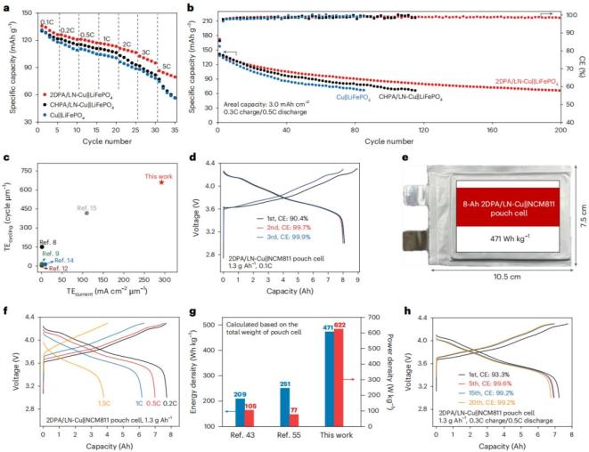 图6. 基于2DPA/ LN-Cu的无负极电池的电化学性能。