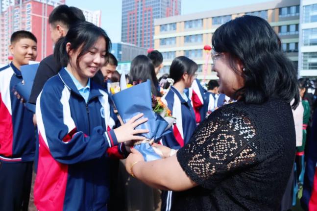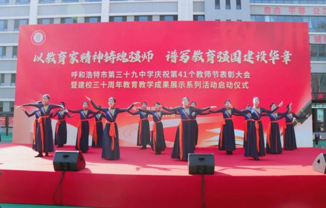 在呼和浩特市第三十九中学教师节表彰大会暨建校三十周年教育教学成果展示系列活动启动仪式中,校园里处处洋溢着节日的欢欣。伴随着庄严的升国旗仪式,全场师生肃立致敬,注视着五星红旗冉冉升起,整个操场气氛热烈而庄重。随后,学生们手捧鲜花走向敬爱的老师,献上最真诚的敬意与祝福,灿烂的笑容与芬芳的鲜花交织成秋日里最温暖的画面。
