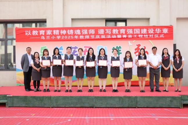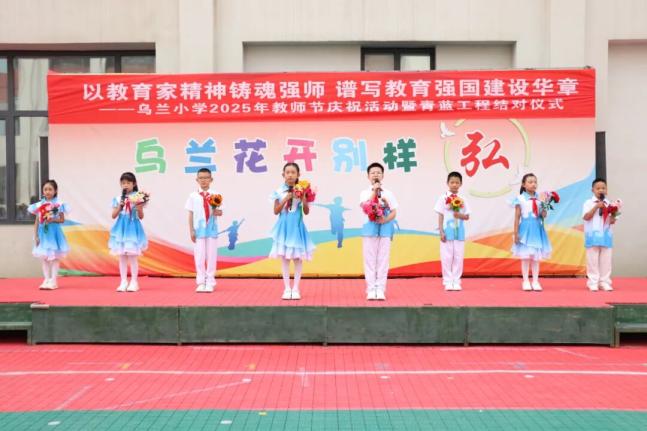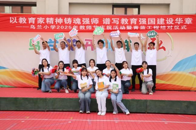乌兰小学以“以教育家精神铸魂强师,谱写教育强国建设华章”为主题,开展了教师节庆祝活动暨青蓝工程结对仪式。“三尺讲台存日月,一支粉笔写春秋。老师的谆谆教诲,是我们成长路上最亮的光。”三年级的学生们表达了对全体教师的感谢。为助力青年教师快速成长,传承优秀教育经验,提高学校教育教学质量,乌兰学校举行了2025年度“青蓝工程”师徒结对仪式。在仪式上,经验丰富的老教师与朝气蓬勃的青年教师结成对子,以老带新、结对帮扶,扎根实际为青年教师们的成长赋能,为学校的教育事业发展注入新的活力,让教育的薪火代代相传。