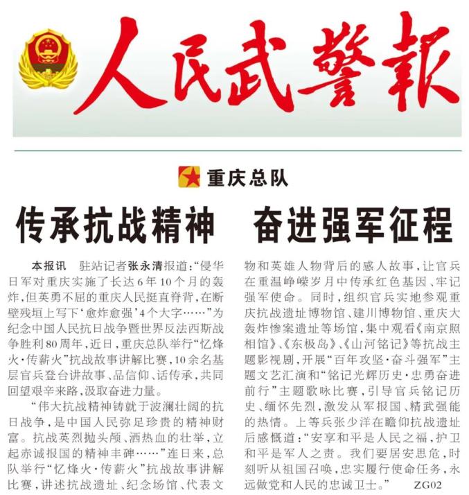 本报讯 驻站记者张永清报道:“侵华日军对重庆实施了长达6年10个月的轰炸,但英勇不屈的重庆人民挺直脊背,在断壁残垣上写下‘愈炸愈强’4个大字……”为纪念中国人民抗日战争暨世界反法西斯战争胜利80周年,近日,重庆总队举行“忆烽火·传薪火”抗战故事讲解比赛,10余名基层官兵登台讲故事、品信仰、话传承,共同回望艰辛来路,汲取奋进力量。