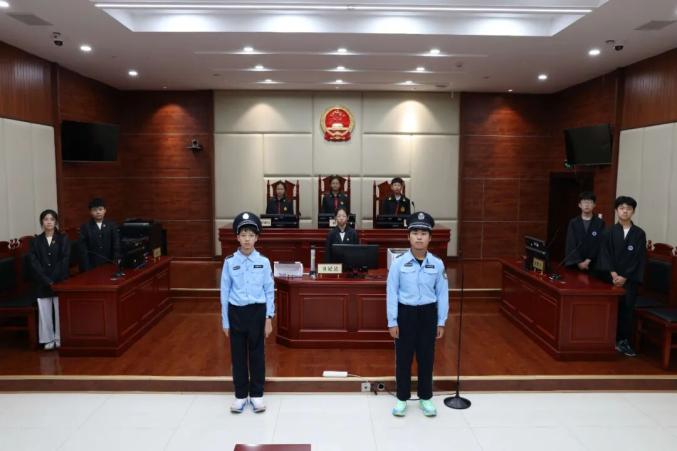 庄严的国徽下,一群身着“小法袍”的孩子正仰头聆听干警讲解;明亮的教室里,穿着笔挺司法制服的法官与学生们互动交流。