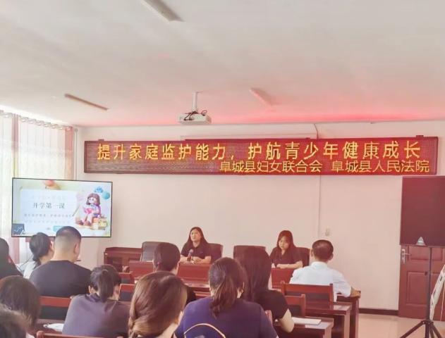 新学期伊始,为切实提高广大家长的监护意识和安全教育能力,营造家庭、学校、社会共同关心未成年人健康成长的良好氛围,近日,阜城法院联合阜城县妇联举办了“家长监护责任大讲堂”专题活动。本次活动作为“开学第一课”系列教育的重要组成部分,旨在引导家长深刻认识到监护职责的重要性,携手共建学生安全防线。