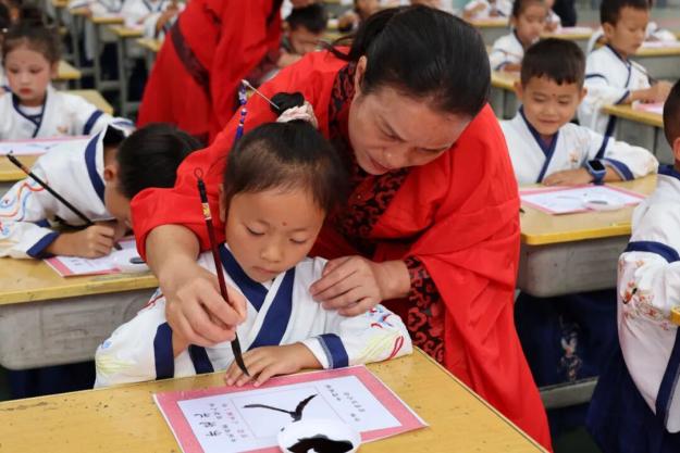 “开笔礼”环节,一年级新生身着传统服饰,依次进行“正衣冠”“朱砂启智”“击鼓鸣志”“启蒙描红”“茶敬亲师”等仪式。整个过程庄重温馨,让孩子们深刻感受到入学是人生新征程的起点。