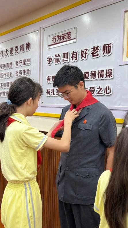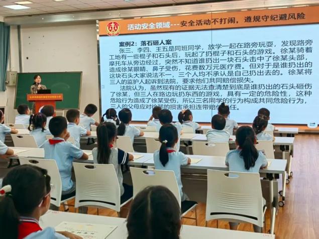 来自各个部门的法治辅导员们也应邀参加辖区中小学的开学典礼,并依托开学典礼的宝贵机会,为孩子们带来精心准备的校园法治安全“第一课”,结合校园中较为常见的问题,通过以案释法的方式,向孩子们送上法律知识和安全寄语,培养孩子们在日常学习生活中形成良好的法治意识与行为规范。孩子们还亲切地为法治辅导员们系上红领巾,这不仅代表了孩子和学校对法治辅导员工作的肯定,更是法治辅导员们担起守护“未”来的重重责任。