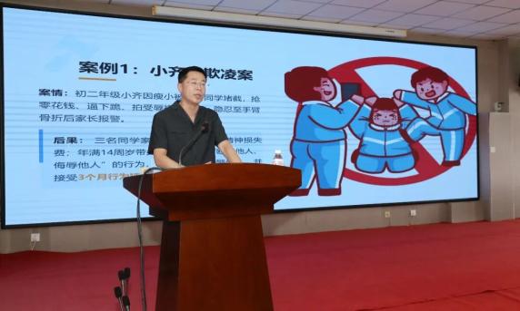 黄鹏飞以“法律是什么”为切入点,结合《未成年人保护法》《预防未成年人犯罪法》核心内容,将法律形象地比作青春路上的“护身符”与“指南针”。通过15周岁学生沉迷网络实施盗窃、初中在校学生校园欺凌致人重伤等多个典型案例,讲解未成年人刑事责任年龄划分、校园欺凌法律后果、网络言论边界等关键问题,让抽象的法律条文变得通俗易懂。
