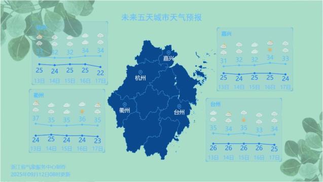 预计未来七天我省多午后雷阵雨,其中明后天(13-14日)雷阵雨范围广,局部有暴雨到大暴雨,短时雨强强,局部伴有8~10级雷雨大风,明天部分仍有35-37℃高温,后天高温大幅缩减;15-16日雷阵雨相对分散,部分有35-37℃高温;17-19日我省又有较大范围雷阵雨,高温再次“撤退”,18-19日浙北不少地方最高甚至不足30℃。