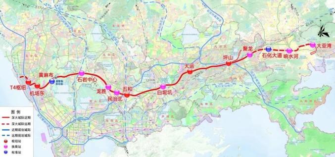 深大城际(深圳段)起自深圳市宝安机场T4站,途经宝安区、龙华区、龙岗区,终至坪山区聚龙站,线路全长约69.2km。线路设计时速为160km。