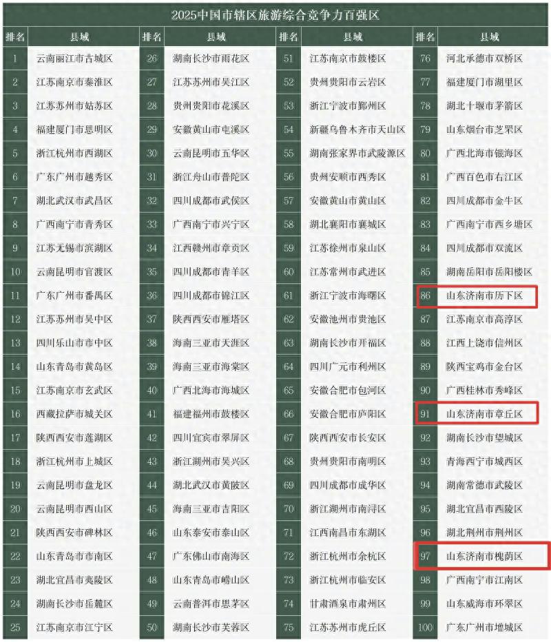 近日,“2025中国市辖区旅游综合竞争力百强区”榜单火热出炉,济南市历下区、槐荫区、章丘区成功上榜,这无疑是对济南旅游发展的高度认可,也为这座历史文化名城再添荣光 !