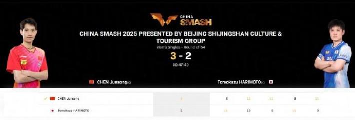 北京时间9月29日晚间,WTT中国大满贯男单1/32决赛,中国球员陈俊菘3比2淘汰日本选手张本智和,五局比分分别为【8-11,12-10,11-8,8-11,11-9】。