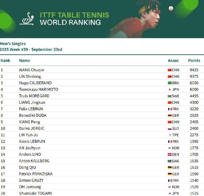 此前,9月23日,2025国际乒联第39周排名公布,其中,张本智和世排第四。