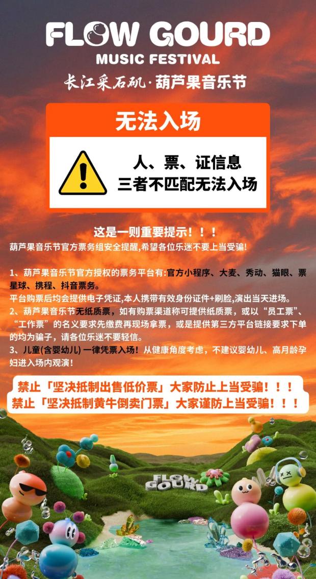 4.请认准官方正规票务平台,切勿轻信所谓“内部票”、“工作票”、“带人观演”、自称“内部工作人员”等不实信息,本场演出强实名,请乐迷朋友们提高警惕,谨防受骗。