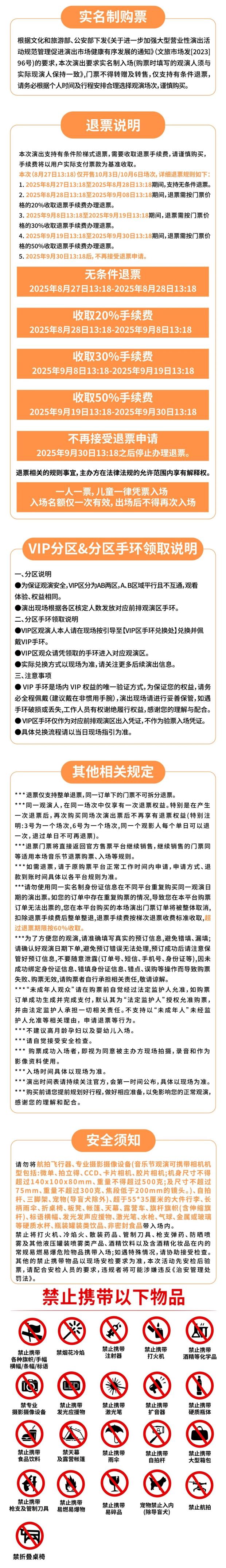 禁止将打火机、冷焰火、散装药品、管制刀具、枪支弹药、防晒喷雾及其他液压罐装喷雾类产品、酒精饮料以及含酒精化妆品在内的常规易燃易爆危险物品携带入场。如遇特殊情况,请协助接受检查,其他的禁止携带物品以现场安检要求为准,本次活动先安检后验票,请配合安检人员的要求,违规者将可能涉嫌违反《治安管理处罚法》。