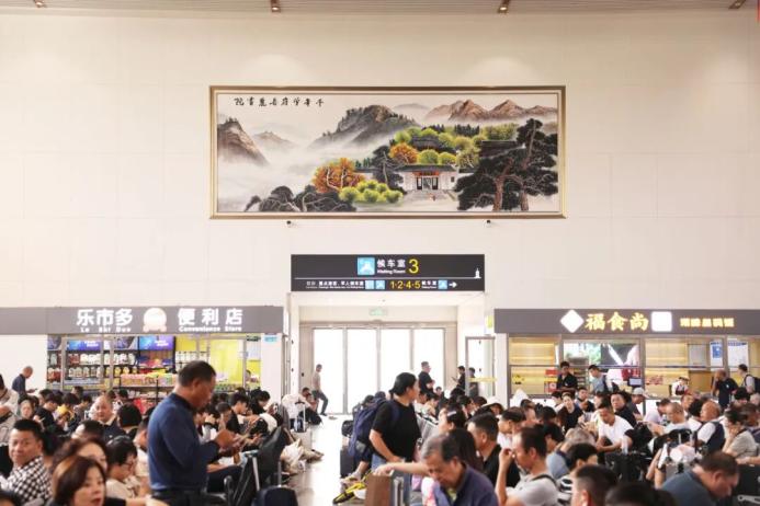 第三候车室岳麓书院主题壁画映着自然光,第四候车室用现代材质还原老长沙元素,营造出浓郁的文化氛围。