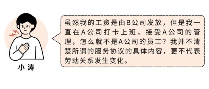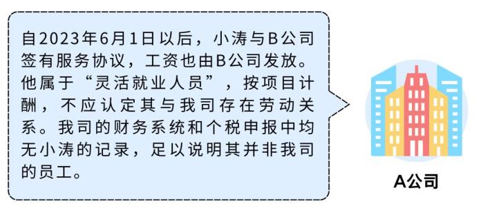 A科技公司(下称A公司)与B科技公司(下称B公司)存在合作关系,双方约定由B公司承揽A公司相关业务,并同步派驻人员提供支持。2023年4月,小涛入职A公司,从事技术服务工作。A公司没有与他签订劳动合同,也没有为他缴纳社会保险。起初两个多月工资由A公司发放,7月起,小涛的工资改由B公司支付,但他的工作地点、工作内容、考勤管理均未发生变化,仍在原办公场所接受A公司的日常管理。