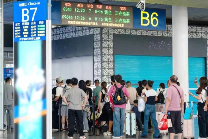 10月1日当天,车站开行列车达1155列,高峰期平均每50秒接发一趟列车,甚至出现17趟列车同时在屏幕上显示检票的壮观场景。
