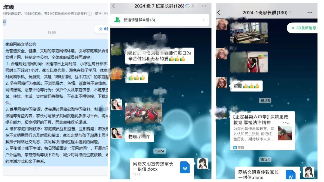 利用班级群等平台推送“网络文明宣传视频”等内容,扩大宣传覆盖面。通过班级群推送《致家长的一封信》,倡导家长共同监督孩子网络行为,形成家校共育合力。组织学生参与“网络文明承诺”线上签名活动,承诺遵守网络道德,不传播虚假信息。