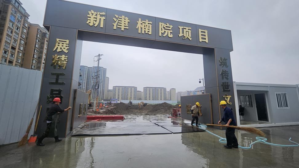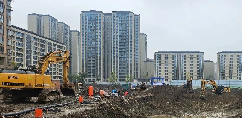 11月7日上午10时,记者来到位于地铁10号线五津站旁、紧邻在建城市商业中心的某住宅小区项目,5台挖掘机正同步在约37亩的工地上挖土作业,挖掘深度约4米,运土车辆有序进出,穿着防水靴的工作人员手持高压水枪持续清理地面,车过无尘,现场忙碌、高效。