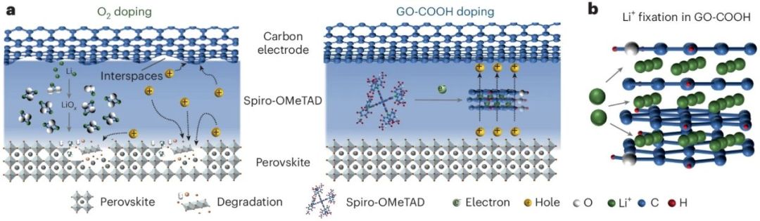 图a.氧气参与的p型掺杂过程与GO-COOH参与的掺杂过程示意图;图b. GO-COOH掺杂实现Li+固定的示意图。