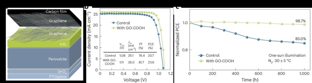 针对这一挑战,研究团队制备了羧基功能化的氧化石墨烯掺杂Spiro-OMeTAD的空穴传输层,利用氧化石墨烯中羧基官能团的强吸电子特性,能够在无需氧气暴露的条件下从Spiro-OMeTAD分子捕获电子,实现对其的高效快速p型掺杂,大幅提高了空穴传输层载流子迁移率及掺杂稳定性;同时利用氧化石墨烯独特的离域π电子结构在空穴传输层表面形成平面共轭电子网络,与碳电极之间构建强π-π共轭的耦合界面,极大地减少了界面电荷传输动力学损失,结合叠合式“双碳”电极结构实现了23.6%的C-PSCs世界最高效率,并获得第三方中国计科院的权威认证。此外,研究发现空穴传输层中锂离子能够插入氧化石墨烯层间形成牢固的Li-C键,从而“锁住”这些可能损害电池长期稳定性的离子,未封装的电池在连续光照1000小时后仍保持98.7%的初始效率,从根本上提升了器件的运行寿命。该项研究成果成功地缩小了碳基钙钛矿太阳能电池与金属电极器件的性能差距,同时保留了其低成本、高稳定性的核心优势。该论文的相关研究得到了国家自然科学基金、国家优秀青年科学基金等项目以及大连理工大学分析测试中心的支持。