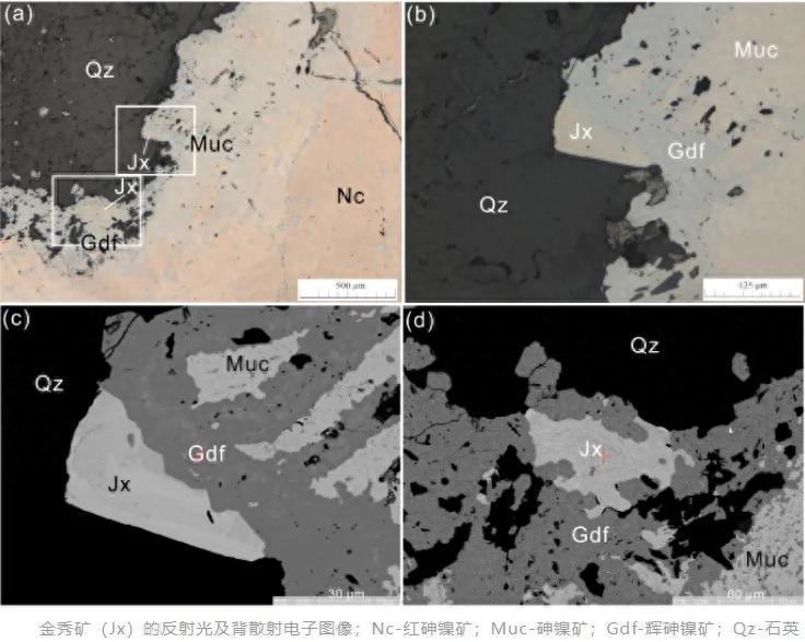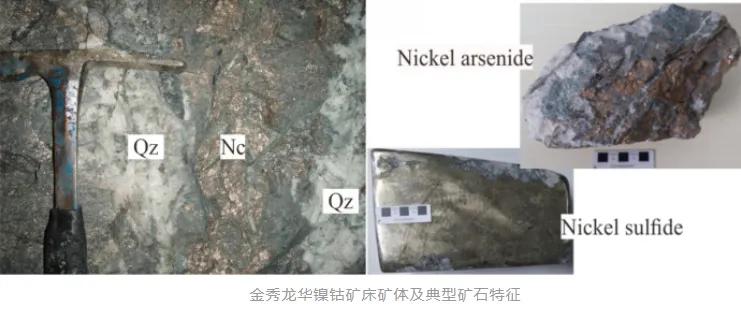 龙华镍钴矿床以高品位脉型镍钴矿化为特征,矿体主要由镍钴砷硫化物组成。金秀矿和贵祥矿的发现,说明龙华镍钴矿床的形成与多期岩浆热液作用有关,含镍矿物主要由早期矿化组成。该过程形成的矿物组合以红砷镍矿为主,含少量砷镍矿、辉砷镍矿,晚期成矿作用含有较多的含钴辉砷镍矿和辉砷钴矿,同时,热液流体中铋和锑元素的含量不断增加,铋和锑取代辉砷镍矿中的砷形成金秀矿。