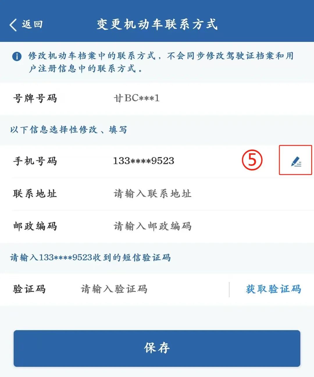 ⑤进入变更机动车联系方式页面,再次点击变更机动车联系方式页面中的“画笔”按钮。