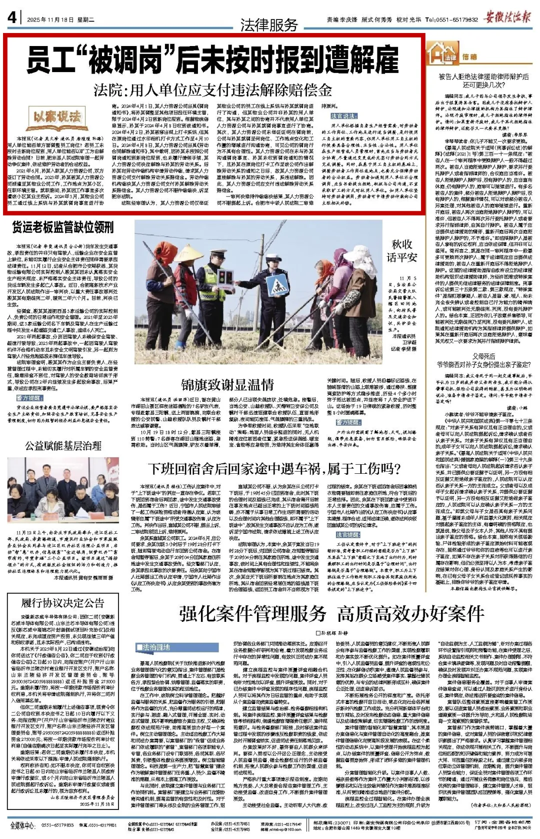 2025年11月18日,《安徽法治报》刊发肥东法院审理的一起劳动争议案件。全文如下: